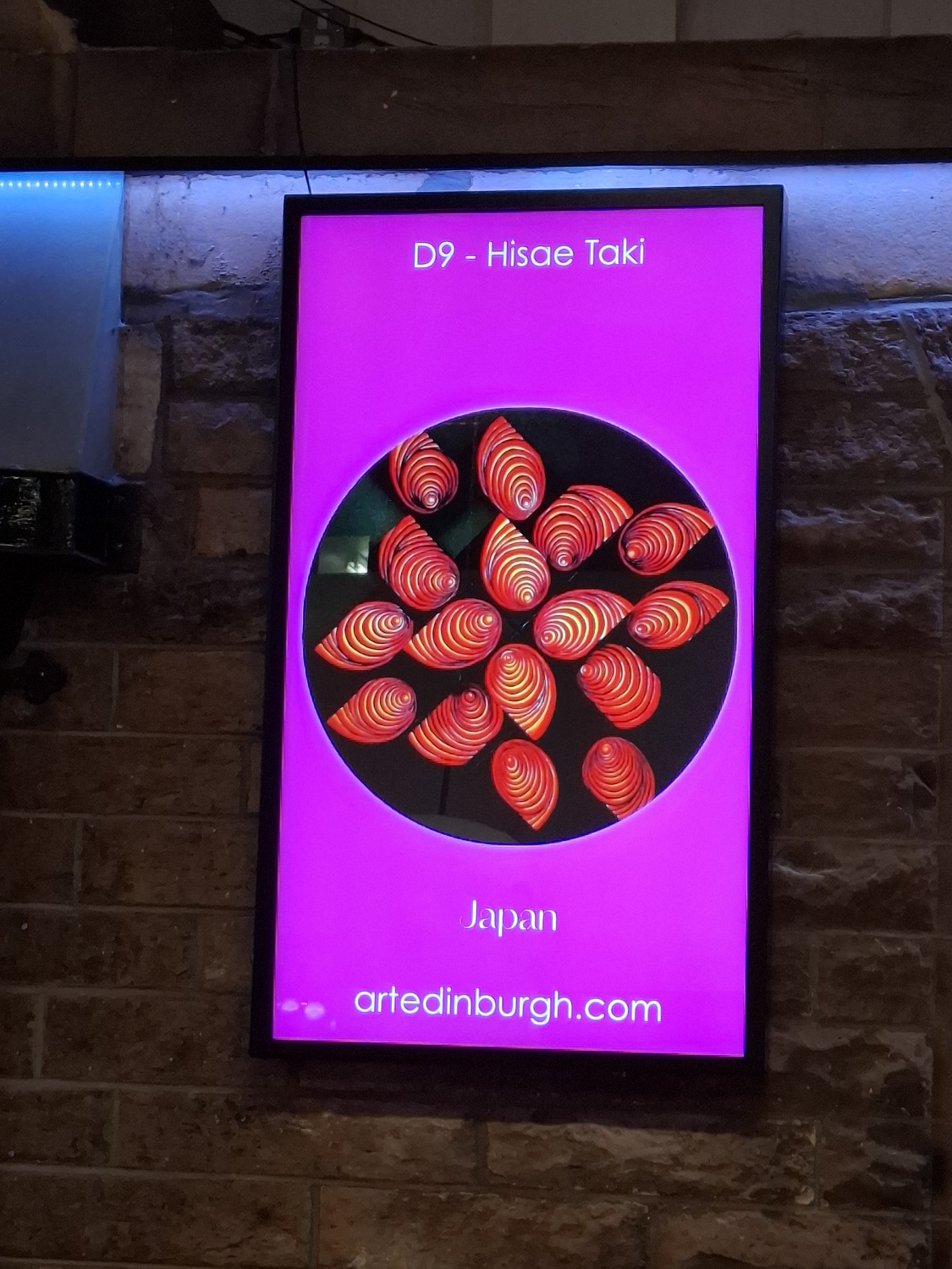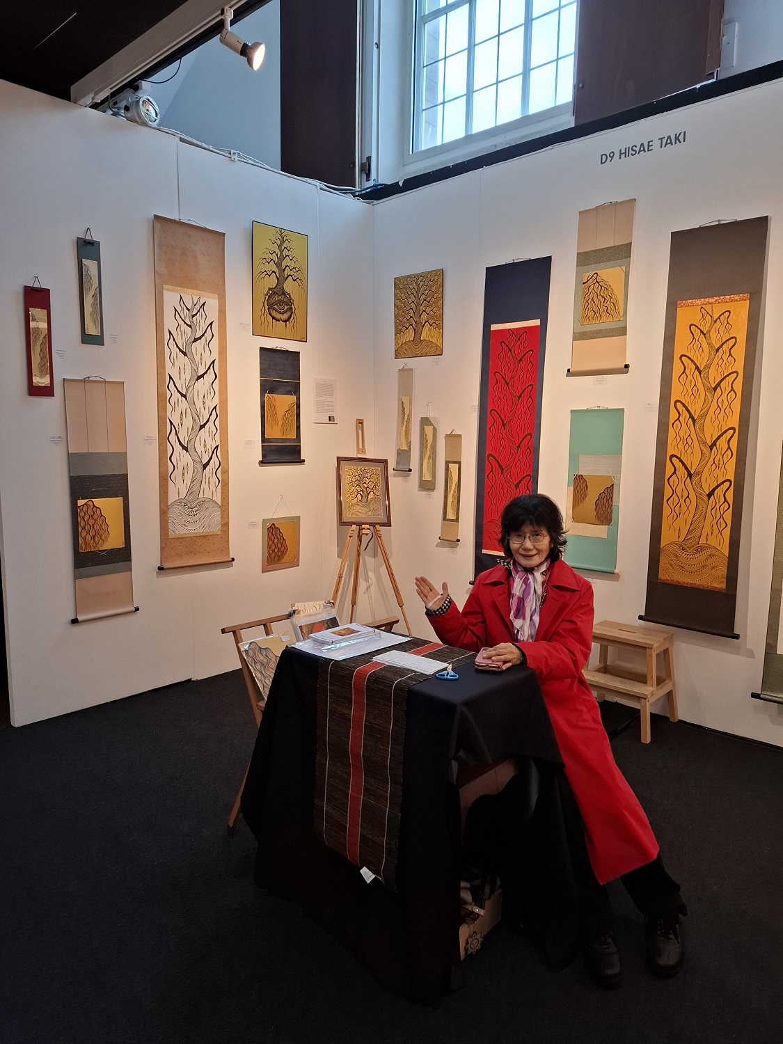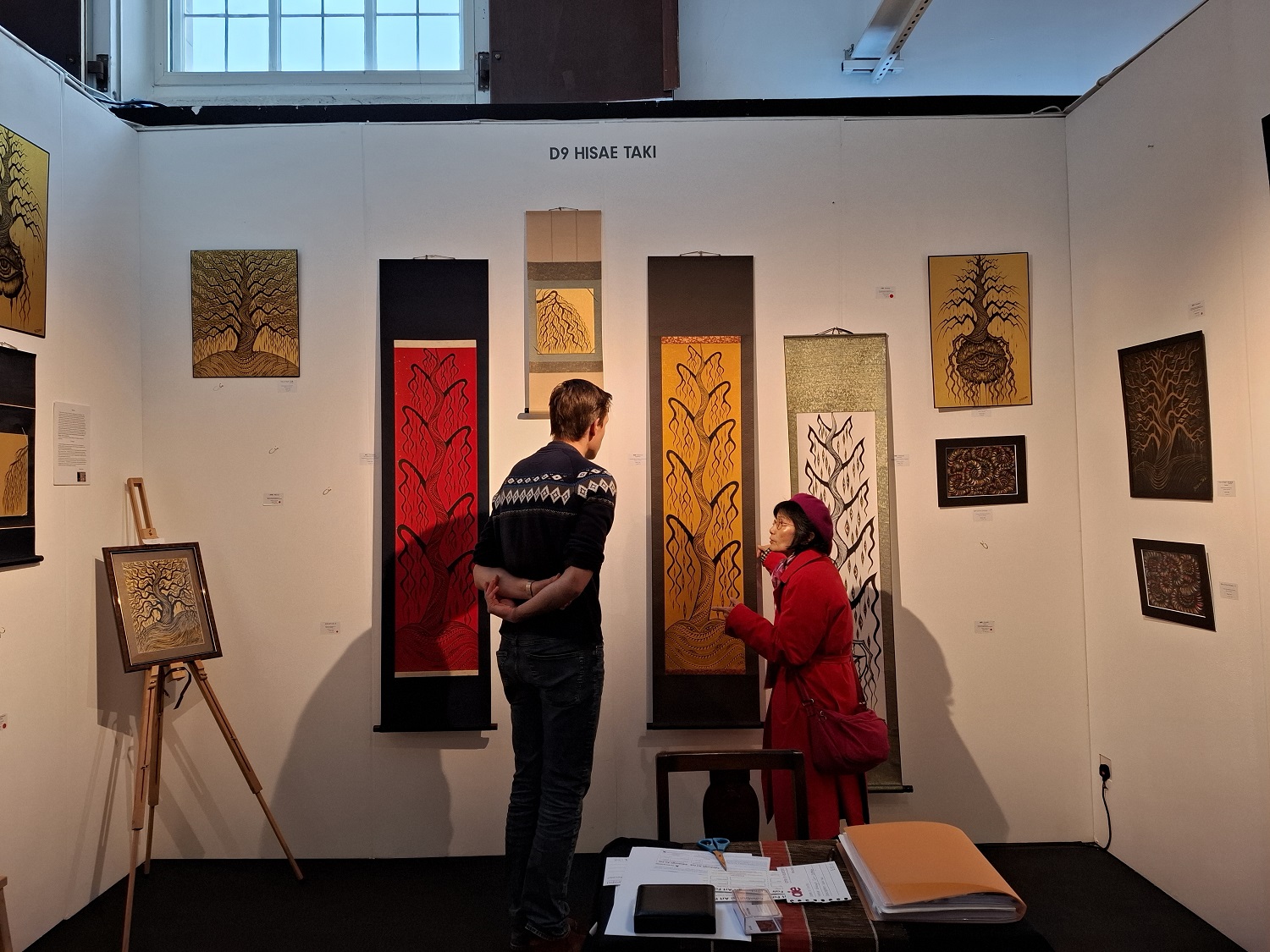 2025年9月19日(金)~21日(日)の間、英国エジンバラ市で開催されたエジンバラアートフェア2025(EAF2025)(主催:Arte in Europa; 会場: Edinburgh Corn Exchange)に絵画作品を出品しました。会期中は、海外からも含めて連日多数の来場者で賑わい、私のスタンドにも数多くの方々が足を運び、熱心に作品を鑑賞頂きました。今回は、海外での出品ということもあり、掛軸を活用して“和”の雰囲気を感じられる作品を多く準備しましたところ、ご来場下さった方々からは、素材や画法、日本文化等に関わる質問を頂く等、とても関心を持って頂きました。おかげで、準備した作品の半数を購入頂くことができました。私の作品が、エジンバラやグラスゴー等のスコットランドのお家で引き続き楽しんで頂けることを嬉しく思っています。