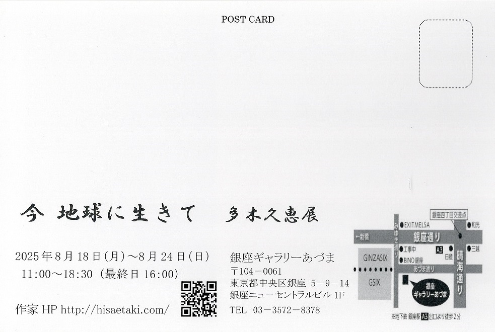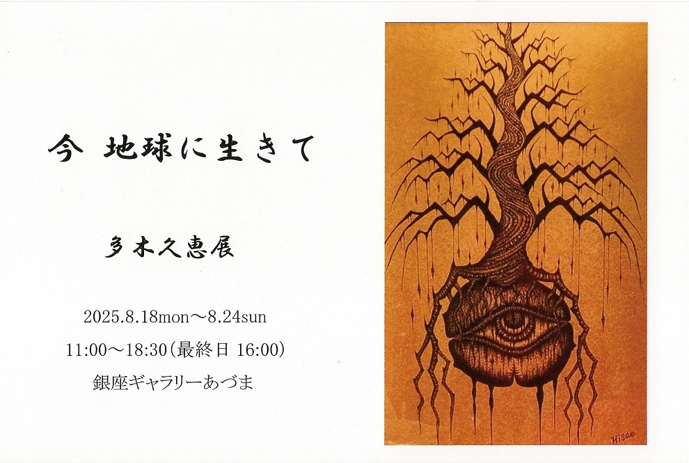 2025年8月18日(月)から24日(日)まで、銀座ギャラリーあづま(東京都中央区銀座5-9-14 銀座ニューセントラルビル1F; TEL 03-3572-8378) におきまして、 個展 「今 地球に生きて 多木久恵 展」を開催します。開館時間は、11:00~18:30(最終日は16:00まで)です。本個展では、大小織り交ぜて、私の作品20点強を展示させて頂く予定です。多くの皆様にお越し頂き、ご鑑賞頂けますと大変嬉しく思います。